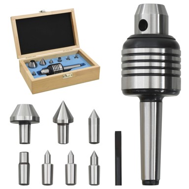 Dugi, tanki i teški radni predmeti mogu se obraditi sigurno i precizno uz ovaj set okretnih šiljaka koji uključuje 7 zamjenjivih glava. Uz pomoć pozicioniranja središnje rupe, radni predmeti imaju visoku točnost dimenzija. Napravljen je od čelika otpornog na toplinu s velikom tvrdoćom, visokom preciznošću i otpornošću na koroziju. Također ima 3000 maksimalnih okretaja u minuti i maksimalno opterećenje od 200 kg.