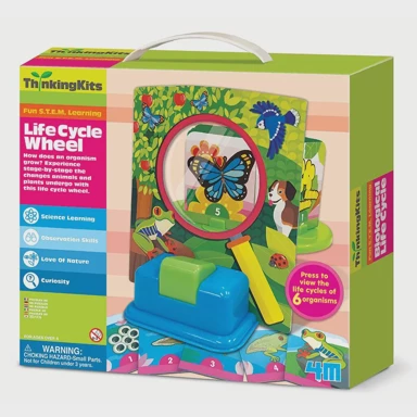 4M Set za učenje Životni ciklus biljaka i životinja omogućuje djeci praćenje razvoja organizama kroz praktičan kotač ciklusa života. Set potiče istraživanje prirode i razumijevanje biologije kroz jednostavne i zabavne aktivnosti. Preporučena dob: 4 do 7 godina.