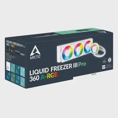 ARCTIC Liquid Freezer III Pro 360mm A-RGB u bijeloj boji donosi kombinaciju velikog aluminijskog radijatora i napredne pumpe s PWM regulacijom za zahtjevne korisnike. Tri 120 mm P12 Pro A-RGB ventilatora pružaju snažan protok zraka i visok statički tlak, što ga čini pogodnim za procesore visokog TDP-a i intenzivno gejming ili profesionalni rad. Elegantna bijela završna obrada i adresabilna RGB rasvjeta naglašavaju estetsku stranu sustava bez kompromisa u učinkovitosti hlađenja.