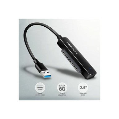 AXAGON ladica 2.5" SATA na USB 3.2 pruža jednostavan i brz način povezivanja 2,5" SATA tvrdih diskova i SSD-ova s računalom putem USB-A priključka. Kompaktan dizajn, trajno priključen kabel i Plug & Play funkcija čine je praktičnim rješenjem za prijenos podataka, kloniranje i vanjsku pohranu.