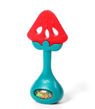 Elastični materijal s neravnom strukturom masira desni, dok zveckajuće kuglice potiču igru i razvoj koordinacije. Lako se hvata i prenosi iz ruke u ruku. Sigurna i izdržljiva, bez BPA. Dimenzije: 14 × 5,5 cm, težina: 40 g.