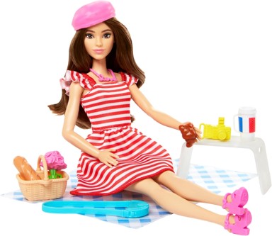Spremna je za piknik u Parizu s ovim setom lutaka Pink Passport. Stvorite prekrasan ambijent na kariranoj dekici s dodacima poput pletene košare, buketa cvijeća, kroasana i bageta. Odjevena je u šik haljinu i beretku, savršenu za šetnju vrtovima. Djeca mogu istraživati svijet s Barbie u svim njezinim avanturama Pink Passport! Piknik u Parizu s Barbie i ovim kompletom lutki Pink Passport! Barbie je odjevena za vrtove u svoju elegantnu prugastu haljinu, štikle, ružičastu beretku i torbicu. Upakirajte savršeni piknik s dodacima kao što su karirani pokrivač, buket cvijeća i pletena košara u koju stane ukusni baguette i kroasan. Djeca (u dobi od 3+) mogu istraživati svijet s Barbie u svim njezinim avanturama Pink Passport! Istisnite rupičasti pečat putovnice iz kutije! Ljubitelji putovanja mogu ih sve pronaći i prikupiti. UPOZORENJE: Opasnost od gušenja - mali dijelovi. Nije prikladno za djecu mlađu od 3 godine.