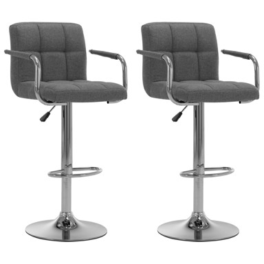 Set barskih stolica od tkanine idealan je za uživanje u nekoliko gutljaja vina u baru, uzimanje zalogaja na šanku ili kao dodatna sjedala kad pozivate goste. Njegov čist i suvremen dizajn upotpunit će svako uređenje interijera. Set barskih stolica ima kromirani čelični okvir, što ga čini znatno stabilnim i izdržljivim. Mekana sjedala podstavljena pjenom, nasloni za leđa i oslonci za noge čine stolice savršenim mjestom za opuštanje. Zahvaljujući plinskom mehanizmu za podizanje, barske stolice mogu se podesiti po visini. Također se mogu okretati za 360 stupnjeva za veću fleksibilnost. Stolice se jednostavno sastavljaju. Isporuka uključuje 2 barske stolice. - Boja: Svjetlosiva - Materijal: Kromirani čelični okvir + presvlaka od tkanine - Ukupne dimenzije: 53 x 52 x (92 - 112) cm (Š x D x V) - Širina sjedala: 43 cm - Dubina sjedala: 37,5 cm - Visina sjedala od tla: 63 - 83 cm - Visina naslona od sjedala: 31 cm - Promjer baze: 41,5 cm - Plinski mehanizam za podizanje - Okretanje za 360 stupnjeva - Isporuka uključuje 2 barske stolice - Tkanina: Pamuk: 90%, Poliester: 10%