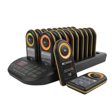 Bežični restoran sustav za pozivanje velikog dometa isporučuje se s 20 dojavljivača i dometom do 500 m na otvorenom. Uređaji nude zvučni, svjetlosni i vibracijski signal, uz više melodija zvona i podesive razine glasnoće za bučna okruženja. Sustav uključuje alarm protiv gubitka izvan dometa, mogućnost proširenja do 997 dojavljivača, grupno pozivanje jednom tipkom i brzu deaktivaciju svih uređaja radi jednostavnijeg upravljanja.
