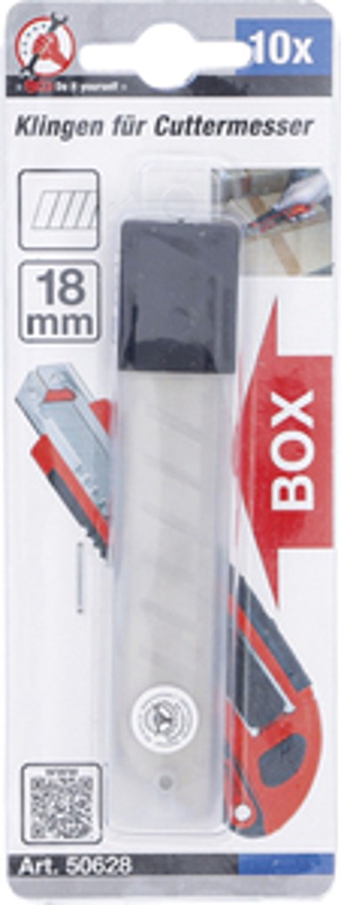 BGS Nožići za skalpel 50628 namijenjeni su skalpelima širine 18 mm i isporučuju se u praktičnom pakiranju. Oštrice osiguravaju čiste i kontrolirane rezove na raznim materijalima. Pogodni su za rad u radionici, industriji i kućnoj upotrebi.