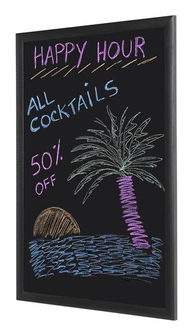 Crna kredna ploča većeg formata izrađena je od izdržljivog poliranog drva te savršeno pristaje interijerima ugostiteljskih i komercijalnih prostora. Lako se čisti, a dolazi s dvjema kredama i zidnim držačem.