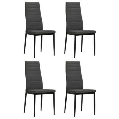 Set od 4 stolice za blagovaonicu s jednostavnim suvremenim dizajnom, savršeno se uklapaju u bilo koji interijer. Stolice imaju čvrst metalni okvir i presvučene su visokokvalitetnom poliesterskom tkaninom koja je meka i izdržljiva. Zahvaljujući debelo podstavljenim sjedalima i naslonima, kao i ergonomskom dizajnu, ove stolice za blagovaonicu su iznimno udobne. Stolice se jednostavno sastavljaju. Isporuka uključuje 4 blagovaonske stolice. - Boja: Tamnosiva - Materijal: Presvlaka od tkanine s metalnim okvirom - Dimenzije: 43 x 44 x 96 cm (Š x D x V) - Dubina sjedala: 40 cm - Visina sjedala od tla: 46 cm - Jednostavno sastavljanje - Isporuka uključuje 4 blagovaonske stolice - Tkanina: Poliester: 100%