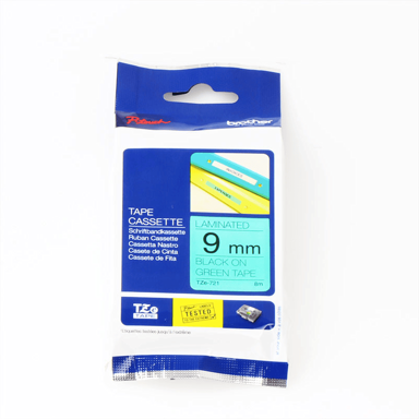 BROTHER Traka TZE-721 crna na zelenoj nudi živopisan kontrast za posebne oznake. Laminirani materijal pruža otpornost u zahtjevnim uvjetima.