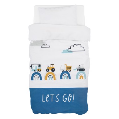 Posteljina Veseli graditelji iz kolekcije Bubaba by FreeON donosi živopisne motive građevinskih vozila u dječju sobu. Set od šest dijelova uključuje navlaku za poplun, jastučnicu, zaštitne ogradice i dodatke za krevetić.
