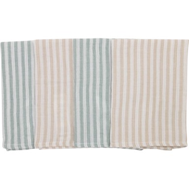 Muslin krpice u zelenim prugicama zahvaljujući laganom i mekanom materijalu omogućuju nježno brisanje i upijanje. Struktura tkanine pogodna je za osjetljivu kožu te smanjuje rizik od iritacija. Dimenzije 40×40 cm pružaju praktičnost u različitim situacijama, od njege lica do korištenja tijekom obroka. Brzo sušenje olakšava svakodnevnu upotrebu i održavanje. Set od četiri komada povećava praktičnost i dostupnost.