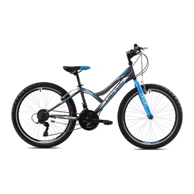 MTB bicikl brenda Capriolo s donjom ramom dizajniran je za pouzdane i dinamične vožnje po zahtjevnim terenima. Gume promjera 24 incha pružaju izvrsnu kontrolu i stabilnost na neravnim stazama. Sa 18 brzina prilagođava se različitim usponima i spustevima, dok sivo/plava boja daje biciklu robustan i sportski izgled.