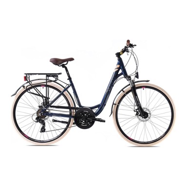 Gradski bicikl brenda Capriolo s donjom ramom pruža moderan i stabilan dizajn za svakodnevnu vožnju. Opremljen je gumama promjera 28 incha koje omogućuju sigurnu i udobnu vožnju po gradskim ulicama. S 21 brzina lako prilagođava tempo i uvjete na cesti, a elegantna crna boja daje mu profinjen i atraktivan izgled.