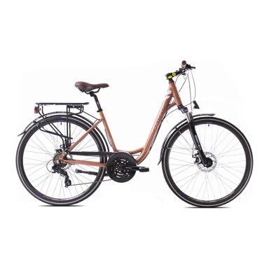Gradski bicikl brenda Capriolo s donjom ramom pruža moderan i stabilan dizajn za svakodnevnu vožnju. Opremljen je gumama promjera 28 incha koje omogućuju sigurnu i udobnu vožnju po gradskim ulicama. S 21 brzina lako prilagođava tempo i uvjete na cesti, a elegantna smeđa boja daje mu profinjen i atraktivan izgled.