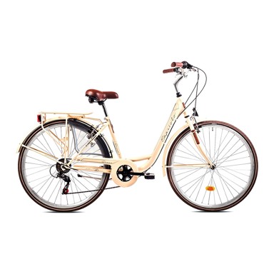 Gradski bicikl brenda Capriolo s donjom ramom pruža moderan i stabilan dizajn za svakodnevnu vožnju. Opremljen je gumama promjera 28 incha koje omogućuju sigurnu i udobnu vožnju po gradskim ulicama. S 6 brzina lako prilagođava tempo i uvjete na cesti, a elegantna bež boja daje mu profinjen i atraktivan izgled.