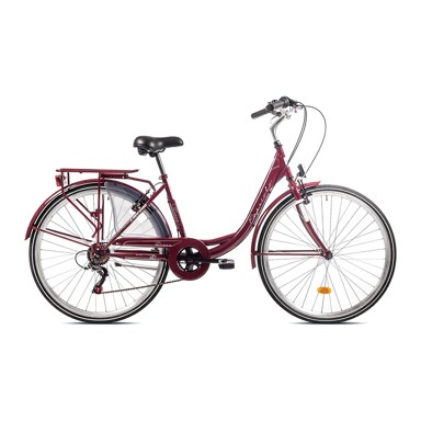 Gradski bicikl brenda Capriolo s donjom ramom pruža moderan i stabilan dizajn za svakodnevnu vožnju. Opremljen je gumama promjera 28 incha koje omogućuju sigurnu i udobnu vožnju po gradskim ulicama. S 6 brzina lako prilagođava tempo i uvjete na cesti, a elegantna crvena boja daje mu profinjen i atraktivan izgled.