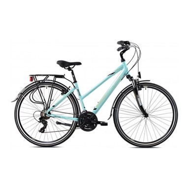 Gradski bicikl brenda Capriolo s donjom ramom pruža moderan i stabilan dizajn za svakodnevnu vožnju. Opremljen je gumama promjera 28 incha koje omogućuju sigurnu i udobnu vožnju po gradskim ulicama. S 21 brzina lako prilagođava tempo i uvjete na cesti, a elegantna tirkizna boja daje mu profinjen i atraktivan izgled.