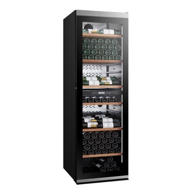 Unutrašnjost hladnjaka je opremljena kliznim policama od punog drveta koje omogućuju fleksibilno pohranjivanje boca uzdužno ili vodoravno, uz integrirano LED bočno osvjetljenje koje ističe svaku bocu elegantno i moderno. Trostruko ostakljena vrata s UV zaštitom i niskom emisijom stakla pružaju zaštitu vašim vinima od štetnih sunčevih zraka, dok visokoučinkovit antivibracijski sustav hlađenja kompresora osigurava stabilno okruženje za vašu kolekciju.