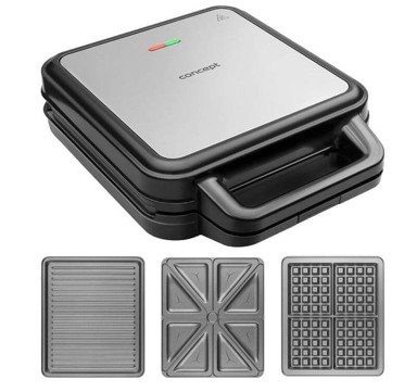 CONCEPT 3-u-1 toster Family SV3080 praktičan je kuhinjski uređaj koji omogućuje brzu pripremu doručka, ručka ili međuobroka za cijelu obitelj. Zahvaljujući trima izmjenjivim pločama i neljepljivoj površini, jednostavno se prilagođava pripremi do četiri tosta, sendviča ili drugih brzih zalogaja, uz lako čišćenje i sigurno rukovanje, što ga čini idealnim rješenjem za svakodnevnu upotrebu u obiteljskom domu.