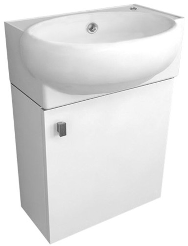 Concepto+ Mini Riva 45 viseća kupaonska baza od oplemenjenog iverala s keramičkim umivaonikom. Dimenzije proizvoda širina 44,8 cm, visina 55 cm, dubina 28 cm, debljina 18 mm. Fronta izrađena od lakiranog medijapana dolazi u bijeloj boji i korpus proizvoda izrađen od iverala kantiran ABS-om također u bijeloj izvedbi visokog sjaja. Concepto+ Mini Riva 45 dolazi sa metalnom krom ručkom i priborom za montažu.