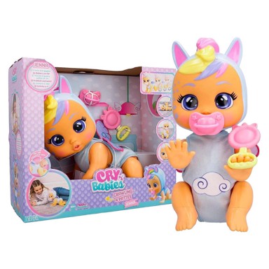 Upoznajte novu Cry Babies Jennu koja veselo puže i smije se! Kada pritisnete gumb na njezinim leđima, počinje puzati. Ako je stavite ležeći i škakljate, pomiče ruke i noge te se smije. Možete je posjesti s zvečkom u ruci, a ona će se igrati s njom. Jenna ima naslikane oči i kosu te nosi slatku pidžamu s motivom jednoroga. Set uključuje dudu i omiljenu zvečku. Plače pravim suzama bez dude, ali prestaje kada joj je vratite. Emitira 35 realističnih bebaćih zvukova za zanimljiviju igru.