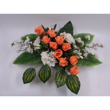 Cvjetni aranžman Eva predstavlja elegantan i profinjen ukras za groblje, dimenzija 68x36x20 cm. Izrađen je od visokokvalitetnih umjetnih cvjetova pažljivo odabranih u nijansama koje simboliziraju mir, ljubav i sjećanje.