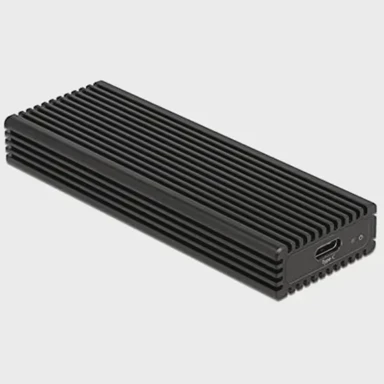 DELOCK vanjsko kombinirano kućište 42004 s USB-C priključkom podržava i M.2 NVMe PCIe i M.2 SATA SSD diskove u formatima od 2230 do 2280. Čipset automatski prepoznaje vrstu umetnutog medija, što olakšava fleksibilnu uporabu jedne vanjske jedinice za različite pogone. Metalno kućište s hladnim rebrima i priloženom termalnom podlogom doprinosi sigurnom radu i dobrim brzinama prijenosa.
