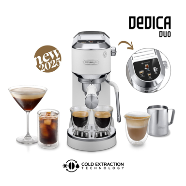 DELONGHI Dedica Duo 890.WI kompaktni ručni aparat za kavu širine samo 15 cm omogućuje pripremu toplih i hladnih napitaka, uključujući Cold Brew. Sustav My LatteArt, tlak od 15 bara i Thermoblock tehnologija osiguravaju preciznu ekstrakciju i kvalitetnu mliječnu pjenu.