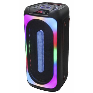Punjiva litij-ionska baterija kapaciteta 4500 mAh osigurava do 5 sati reprodukcije, a puni se za 4-6 sati. Zvučnik ima dimenzije 28 x 26 x 58.5 cm i teži 6.98 kg, dolazeći u crnoj boji. LED svjetla s 10 različitih efekata i 7 boja doprinose atmosferi, dok TWS funkcija omogućuje uparivanje dva zvučnika za pravi stereo doživljaj. U pakiranju su uključeni punjač i upute za uporabu, čineći ovaj model savršenim izborom za nezaboravne zabave.