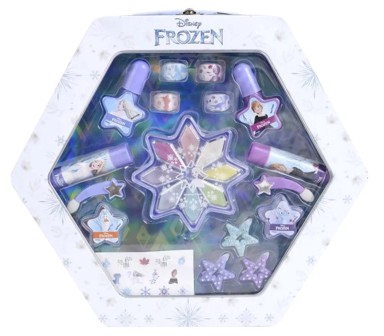 Kraljevska torbica za šminku Disney Frozen II sadrži sigurnu šminku i dodatke prilagođene djeci, uključujući paletu sjenila, ruž za usne, lak za nokte, naljepnice za nokte, prstenje i kopče za kosu. Torbica pruža zabavno iskustvo transformacije od glave do pete i omogućuje djeci da uđu u čarobni svijet Frozena dok razvijaju kreativnost i stil.