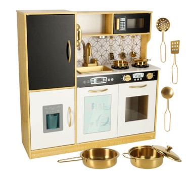 Dječja drvena kuhinja sa svjetlosnim i zvučnim efektima omogućuje malim kuharima zabavu uz imitaciju stvarne kuhinje. Ploča za kuhanje s plamenicima, sudoper s pokretnom slavinom i brojne druge funkcije potiču razvoj mašte i vještina u igri.