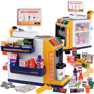 Set samoposlužne trgovine s hladnjakom i aparatom za kavu uključuje zvučnu blagajnu, skener, te različite proizvode poput sokova i jogurta, omogućujući djeci igru u samostalnoj trgovini. Set razvija socijalne vještine i maštu.