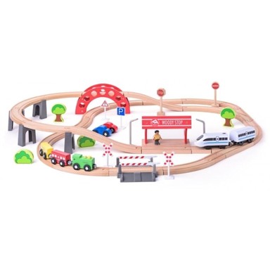 Set s viaduktom i lokomotivom uključuje 60 drvenih elemenata koji omogućuju kreativno slaganje staze. Kvalitetna izrada i bogata oprema poput prometnih znakova, drveća i figurica pružaju potpunu zabavu za djecu od 3 godine.