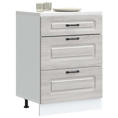 Donji kuhinjski element optimizira vaš kuhinjski prostor, pružajući dovoljno prostora za pohranu vaših osobnih stvari! - Stabilan i izdržljiv materijal: Konstruirano drvo izdržljiv je i stabilan materijal s glatkom površinom koja je otporna na vlagu, savijanje i cijepanje, što ga čini pouzdanim izborom za razne projekte. - Dovoljno prostora za pohranu: donji kuhinjski ormarić nudi dovoljno prostora za pohranu zdjela, tanjura, lonaca i drugih kuhinjskih aparata. - Praktična vrata: Vrata pomažu u održavanju čistog i organiziranog prostora skrivajući kuhinjske uređaje i nered iza njih. - Podesive noge: Noge ovog ormarića mogu se podesiti po visini kako bi odgovarale rasporedu vaše kuhinje. - Jednostavan za održavanje: zahvaljujući glatkoj površini, ovaj kuhinjski donji ormarić lako se čisti vlažnom krpom i zahtijeva manje održavanja. Upozorenje: - Kako bi se spriječilo prevrtanje, Proizvod mora se upotrebljavati s uključenim priborom za montiranje na zid. Dobro je znati: - Vijci i tiple za unutrašnjost zida nisu uključeni. Potražite i upotrijebite vijke i tiple prikladne za vaše zidove. Ako niste sigurni, potražite stručni savjet. Pažljivo pročitajte i slijedite svaki korak uputa. - Boja: Boja sivog hrasta sonome - Materijal: Konstruirano drvo - Ukupne dimenzije: 60 x 46 x 81,5 cm (Š x D x V) - Dimenzije ladica: 51,5 x 38,5 x 16 cm (Š x D x V) - Dimenzije ladice (S): 51,5 x 38,5 x 27 cm (Š x D x V) - Naziv asortimana: Kalmar - S podesivim nožicama - Radna ploča nije uključena u isporuku - Sastavljanje potrebno: Da