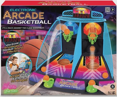 To je utrka 2 igrača protiv vremena ispucavanja! Donesite ushit i uzbuđenje igraonice kući uz elektroničku arkadnu igru košarke. Baš kao u arkadnoj igri ispucajte što više lopti u koš kako biste povećali rezultat i preuzeli vodstvo. Veliki LED semafor uključuje odbrojavanje od 60 sekundi, kao i rezultate domaćih i gostiju. Svaki koš vrijedi 2 boda, ali za zadnjih 15 sekundi povećava se na 3 boda kada se oglasi alarm. Zvučni efekti stadiona povećavaju uzbuđenje dok se bodovi ostvaruju i sekunde teku, a mjerač vremena povećava napetost. Precizni izbacivač košarkaških lopti s opružnim pogonom omogućuje brzu akciju ispucavanja.