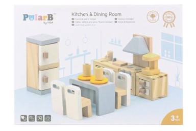 Drvena kuhinja i blagovaonica dodatak je kućici za lutke u obliku seta namještaja u pastelnim bojama. Set obično uključuje kuhinjski blok, stol, stolice, hladnjak i sitne dodatke, čime omogućuje djeci da osmišljavaju realistične prizore kuhanja i blagovanja. Drveni materijal i pažljivo oblikovani detalji čine ga dekorativnim i trajnim dijelom igre u lutkarskoj kući.