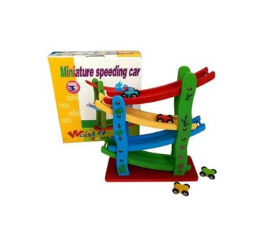 Set uključuje stazu s četiri razine i četiri drvena autića idealna za male ruke. Jednostavan, ali zabavan mehanizam osigurava sate igre i učenja o uzroku i posljedici. Namijenjena je djeci od 3 godine i posjeduje sigurnosne standarde za bezbrižnu igru.