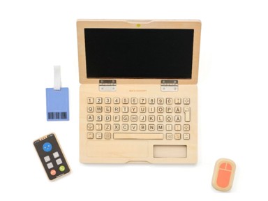 Drveni laptop s priborom brenda izrađen je od FSC certificiranog drva i sadrži četiri dijela: računalo s tipkama koje se mogu pritiskati, mobitel, miš i identifikacijsku karticu. Zaslon prijenosnog računala funkcionalno je dizajniran kao ploča za crtanje po kojoj djeca mogu pisati kredama (nije uključeno). Ova igračka potiče razvoj dječje mašte i pruža interaktivan način za upoznavanje sa svijetom odraslih, istovremeno pomažući u učenju slova i brojeva.