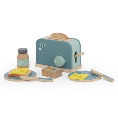 Drveni toster u zelenoj boji pretvara doručak u zabavnu igru – djeca mogu „tostirati” kruh, pritiskati ručicu i posluživati tost s dodacima, razvijajući kreativnost, motoriku i razumijevanje svakodnevnih rituala, uz sigurnu FSC drvenu izradu i dječje boje.
