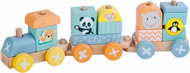 Drveni vlakić s 13 šarenih životinja omogućuje djeci zabavu u stvaranju vlastitog vlaka s putnicima. Igračka je izrađena od netoksičnih materijala, sigurna za djecu od 18 mjeseci, te ispunjava sigurnosne standarde EN71.
