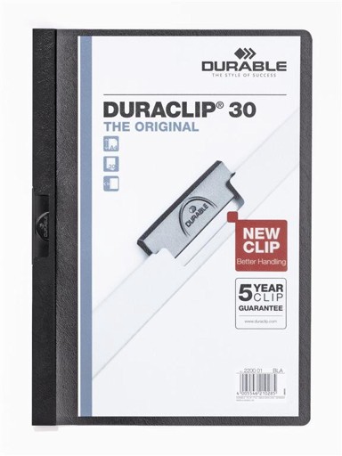 Durable Duraclip 2200 crna mapa nudi jednostavno i pouzdano uvezivanje do 30 listova bez bušenja, uz prozirnu prednju i crnu stražnju koricu. Format A4 i klasična crna boja čine je idealnim izborom za formalne prezentacije, ugovore i važnu poslovnu dokumentaciju.