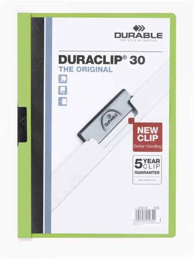 Durable Duraclip 2200 zelena mapa pruža urednu pohranu do 30 A4 listova bez bušenja, a zelena poleđina pomaže pri vizualnoj kategorizaciji dokumenata. Prozirna prednja korica naglašava naslovnu stranicu, što je posebno praktično za projekte, tehničku dokumentaciju i interne materijale.