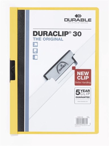 Durable Duraclip 2200 žuta mapa svojim živim bojama olakšava brzo prepoznavanje sadržaja, dok prozirna prednja korica jasno prikazuje naslov dokumenta. Uvezivanje do 30 A4 listova bez bušenja čini je odličnim rješenjem za označavanje prioritetnih ili tematskih dokumenata.