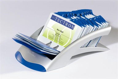 DURABLE Vegas stalak Visifix Desk u srebrnoj boji nudi kapacitet za 200 posjetnica zahvaljujući 100 plastičnih košuljica i abecednim pregradama A–Z. Kartice se lako umeću i uklanjaju, a mogućnost proširenja dodatnim džepovima povećava fleksibilnost organizacije. Pogodan je za uredske stolove i pregledno vođenje kontakata.