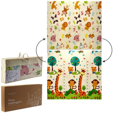 Obrazovna sklopiva prostirka izrađena je od sigurne XPE pjene i pogodna je za djecu od najranije dobi. Dimenzije 180 x 200 cm pružaju prostrano područje za igru, dok dvostrani uzorci s motivima životinja i brojeva potiču senzornu stimulaciju i učenje. Zahvaljujući laganom i sklopivom dizajnu, lako se prenosi i održava.