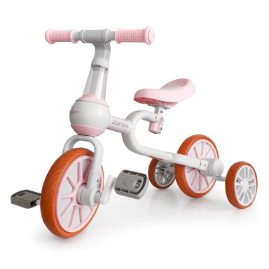 ECOTOYS 4u1 dječji bicikl bijelo-rozi raste s vašim djetetom zahvaljujući četiri načina vožnje i podesivoj visini sjedala. Lagana i izdržljiva konstrukcija s certifikatima sigurnosti EN71, SGS i CE osigurava zabavno i sigurno učenje ravnoteže za djecu od 2 godine.