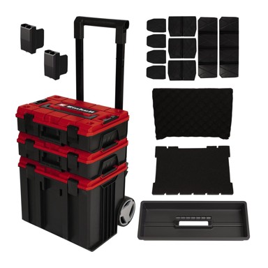 Član modularnog E-Case sustava iz Einhella. Idealna za skladištenje i transport alata i pribora. Praktičan sustav zaključavanja za spajanje naslaganih kutija i kovčega osigurava sustavan i siguran red tijekom transporta. Kutija za alat izrađena je od polipropilena i ima visoku čvrstoću, otpornost na toplinu i udarce. Stabilna konstrukcija omogućuje ukupnu nosivost do 120 kg. Strojevi i alati mogu se jednostavno transportirati zahvaljujući teleskopskoj i posebno širokoj ručki.