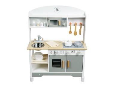 Dječja drvena kuhinja EliNeli u neutralnim bojama omogućuje djeci da uživaju u kuhanju, pečenju i drugim kuhinjskim aktivnostima. Opremeljena je s pećnicom, mikrovalnom, štednjakom, sudoperom i drugim aparatima, stvarajući realistično kuhinjsko okruženje.