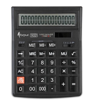 FORPUS Kalkulator 11021 donosi veliki 16-znamenkasti zaslon, dvostruko napajanje i dvije memorije, idealan za zahtjevnije uredske izračune.