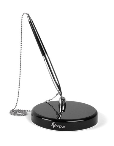 Stolna kemijska olovka s metalnim lančićem osigurava stabilnost i sprječava pomicanje. Postolje od kompaktne plastike omogućuje uredan i praktičan rad.