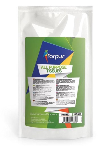 FORPUS višenamjenske maramice u refill pakiranju namijenjene su dopuni, uz antistatički učinak i čišćenje bez razmazivanja. Prikladne su za monitore, ekrane prijenosnih računala, tableta, mobitela i televizore, kao i za staklene površine kopirki i skenera. Pakiranje sadrži 100 komada i predviđeno je za kontinuiranu uporabu.